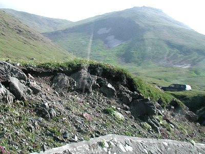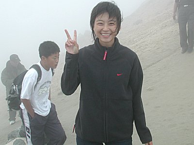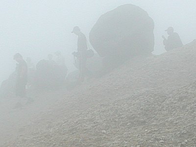 がかかっていました。その中を5分も登ると天池が見える筈の尾根に出ましたが、あいにくのガスで何も見えず