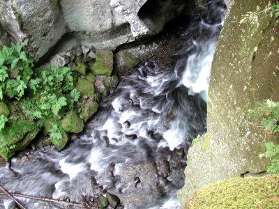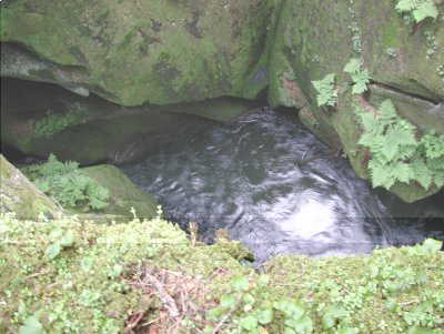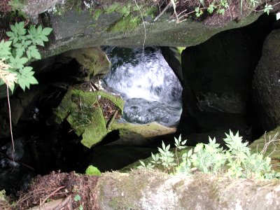 地面の割れ目があり、こわごわ覗きこむと垂直に約10メートル落ち込み、そこを渓谷状に水が流れています。